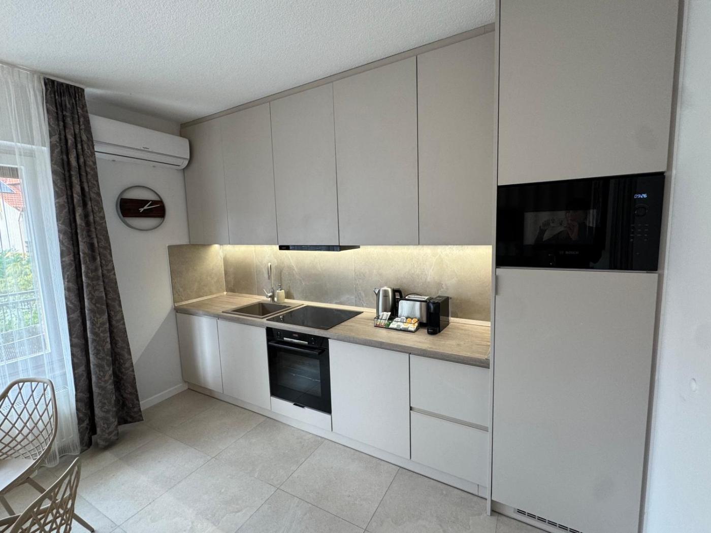 One-Bedroom Apartment. Guests can make meals in the kitchen that features a stovetop, a refrigerator, a dishwasher and kitchenware. The air-conditioned apartment features a flat-screen TV with cable channels, a private entrance, a tea and coffee maker, a wardrobe as well as garden views. The unit has 2 beds.