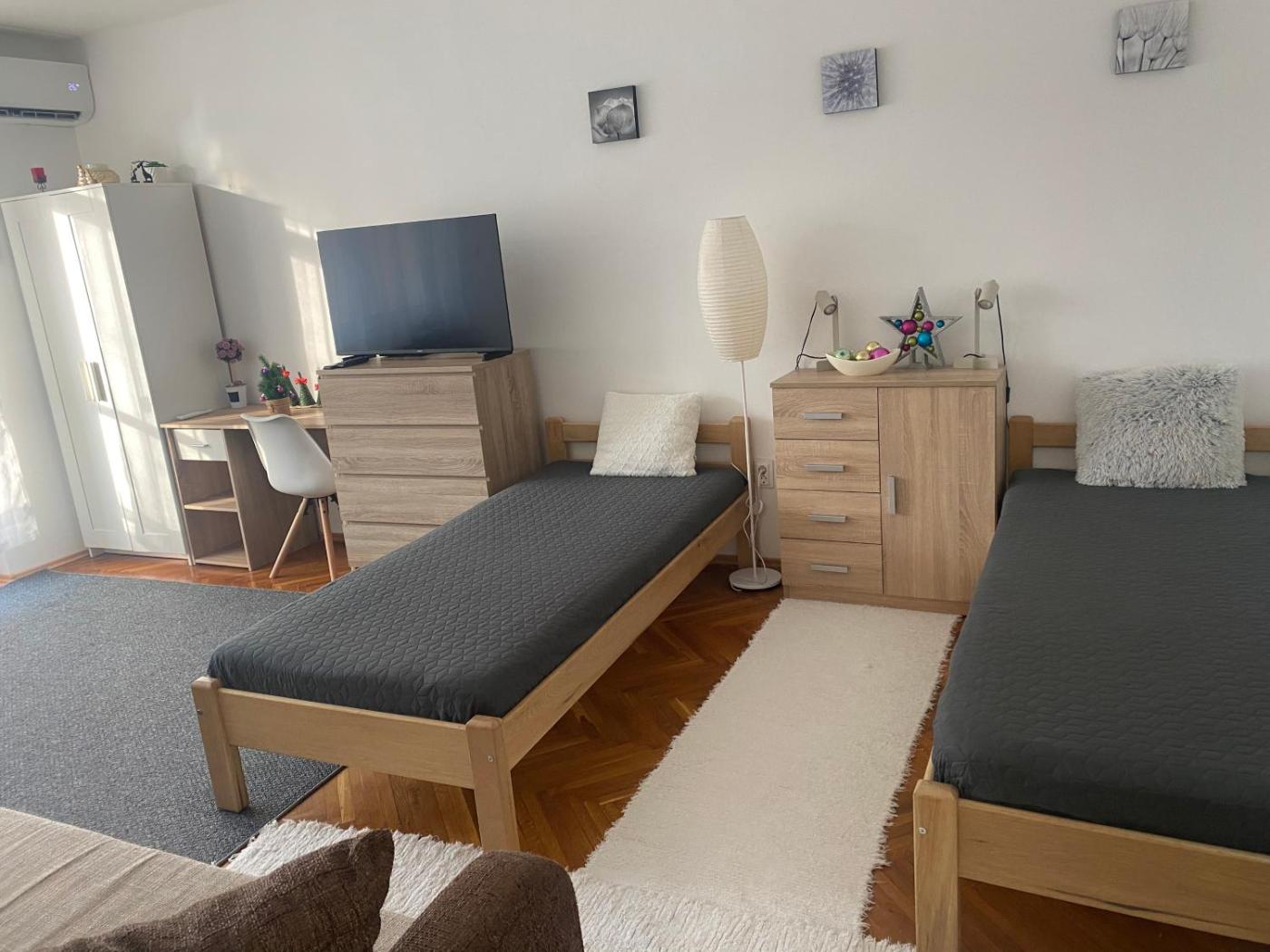 Apartment with Balcony. Featuring a private entrance, this air-conditioned apartment comprises a kitchen, 2 bedrooms and 1 bathroom with a shower and a hairdryer. Meals can be prepared in the kitchen, which comes with a stovetop, a refrigerator, kitchenware and an oven. Boasting a terrace with city views, this apartment also provides a washing machine and a flat-screen TV with cable channels. The unit offers 5 beds.