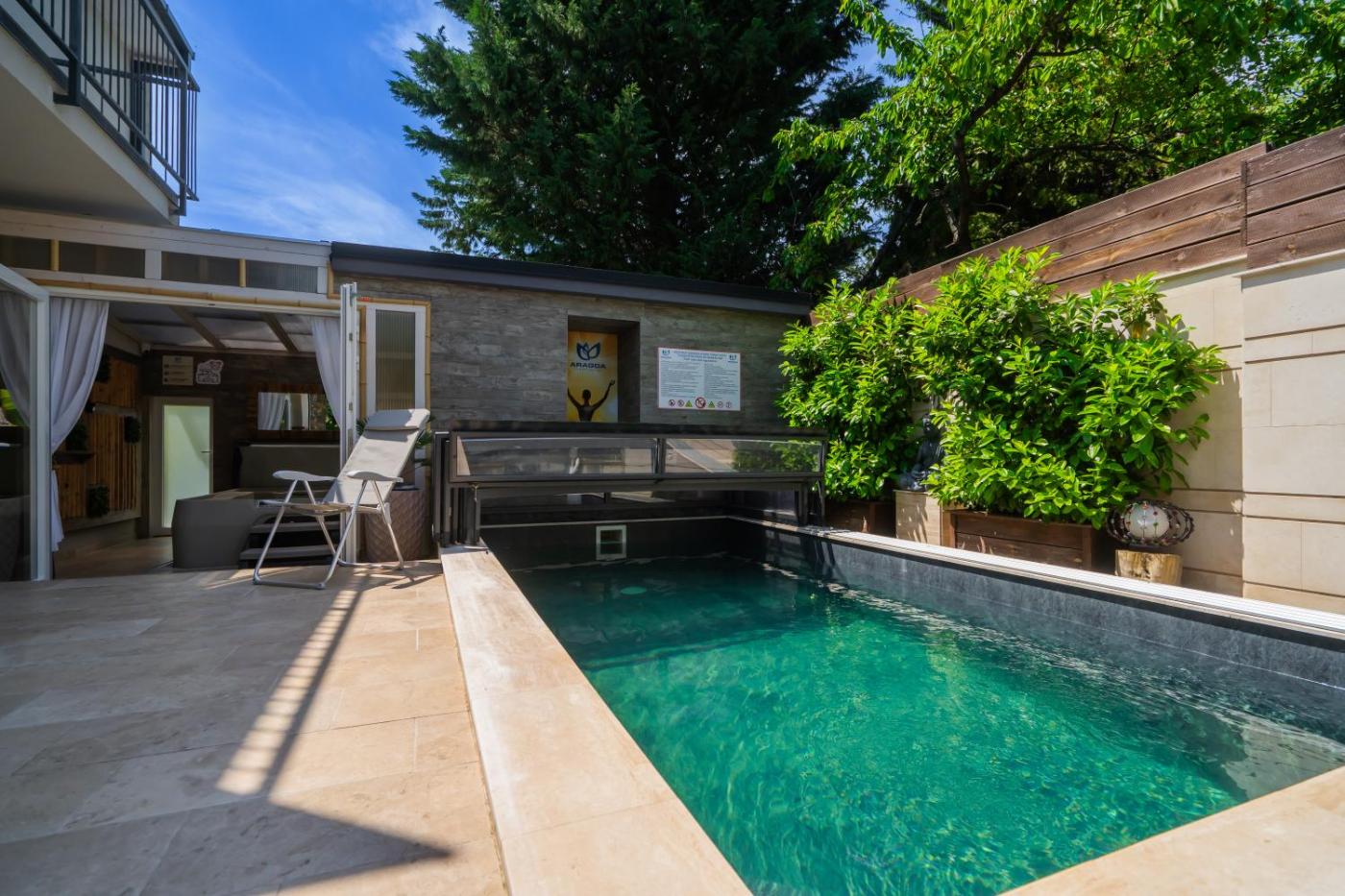 Superior One-Bedroom Apartment with Balcony. This apartments standout features are the private pool and hot tub. Boasting a private entrance, this air-conditioned apartment includes 1 living room, 1 separate bedroom and 1 bathroom with a shower and a hairdryer. The well-equipped kitchen has a stovetop, a refrigerator, kitchenware and a microwave. Featuring a terrace with garden views, this apartment also offers a washing machine and a flat-screen TV with cable channels. The unit has 2 beds.